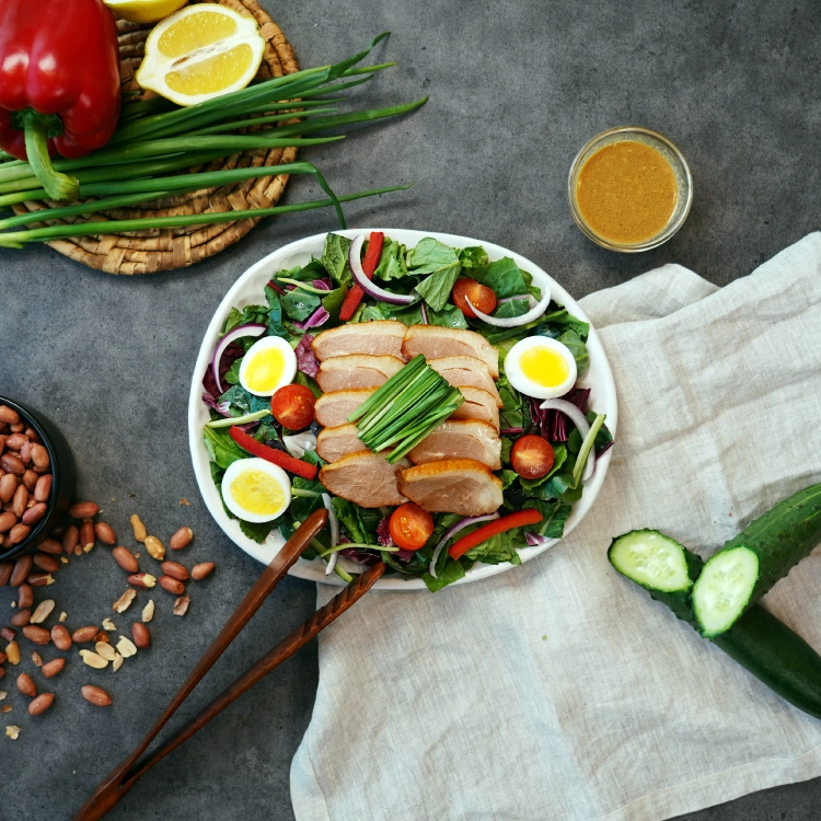 훈제오리와 아삭한 파프리카, 향긋한 쪽파와 부추를 토핑으로 담았습니다. 땅콩의 맛을 강조한 드레싱은 마치 월남쌈을 먹는 기분을 낼 수 있어요. 입한가득 푸짐하게 먹어도 칼로리는 가벼운 훈제오리 샐러드입니다.